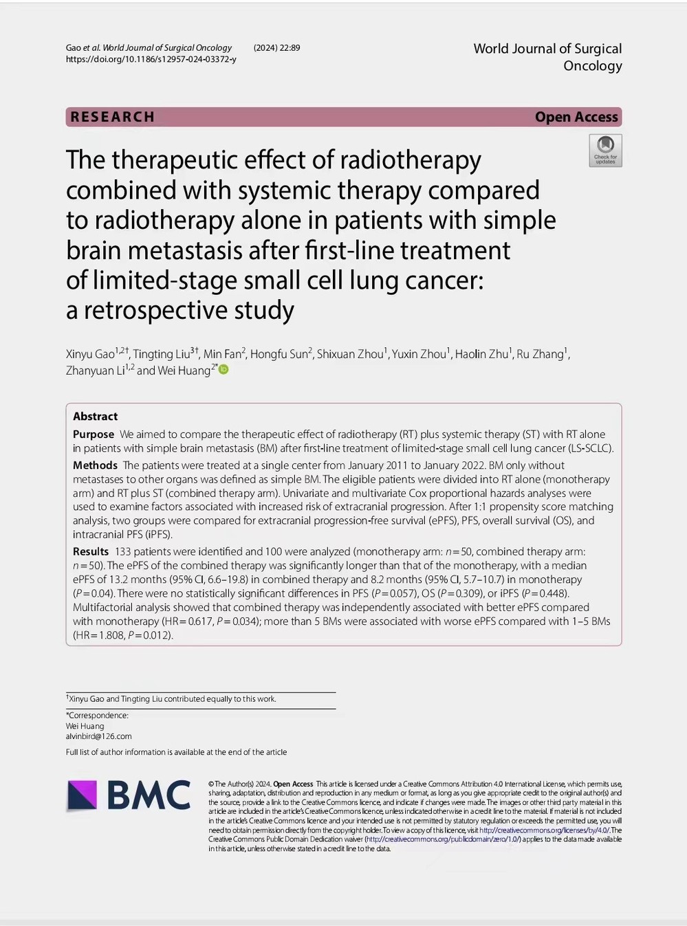 91暗网 2022级本科生周师煊、周宇欣、朱皓粼、张如以共同作者的身份在肿瘤学期刊《World Journal of Sugical Oncology》(IF=3.2)上发表研究论文“The therapeutic effect of radiotherapy combined with systemic therapy compared to radiotherapy alone in patients with simple brain metastasis after first-line treatment of limited-stage small cell lung cancer: a retrospective study”,山东省肿瘤医院黄伟教授为通讯作者。