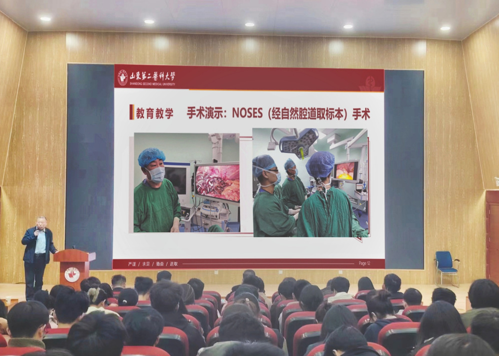 在新学期第一课上,学院副院长、第一附属医院急诊科主任李军从“早临床”的角度出发,为同学们展示了经食道胃癌、经阴膀胱癌、经气管肺癌等腔镜手术的操作视频,与传统手术操作比较,腔镜手术创伤小、术后病人恢复快、生活质量高。他以一名老学长的身份与同学们共勉:从事临床工作需要具备深厚的理论知识、精湛的实践技能和良好的人文素养,要坚持不懈,努力奋斗,做好充足的准备面对未来。