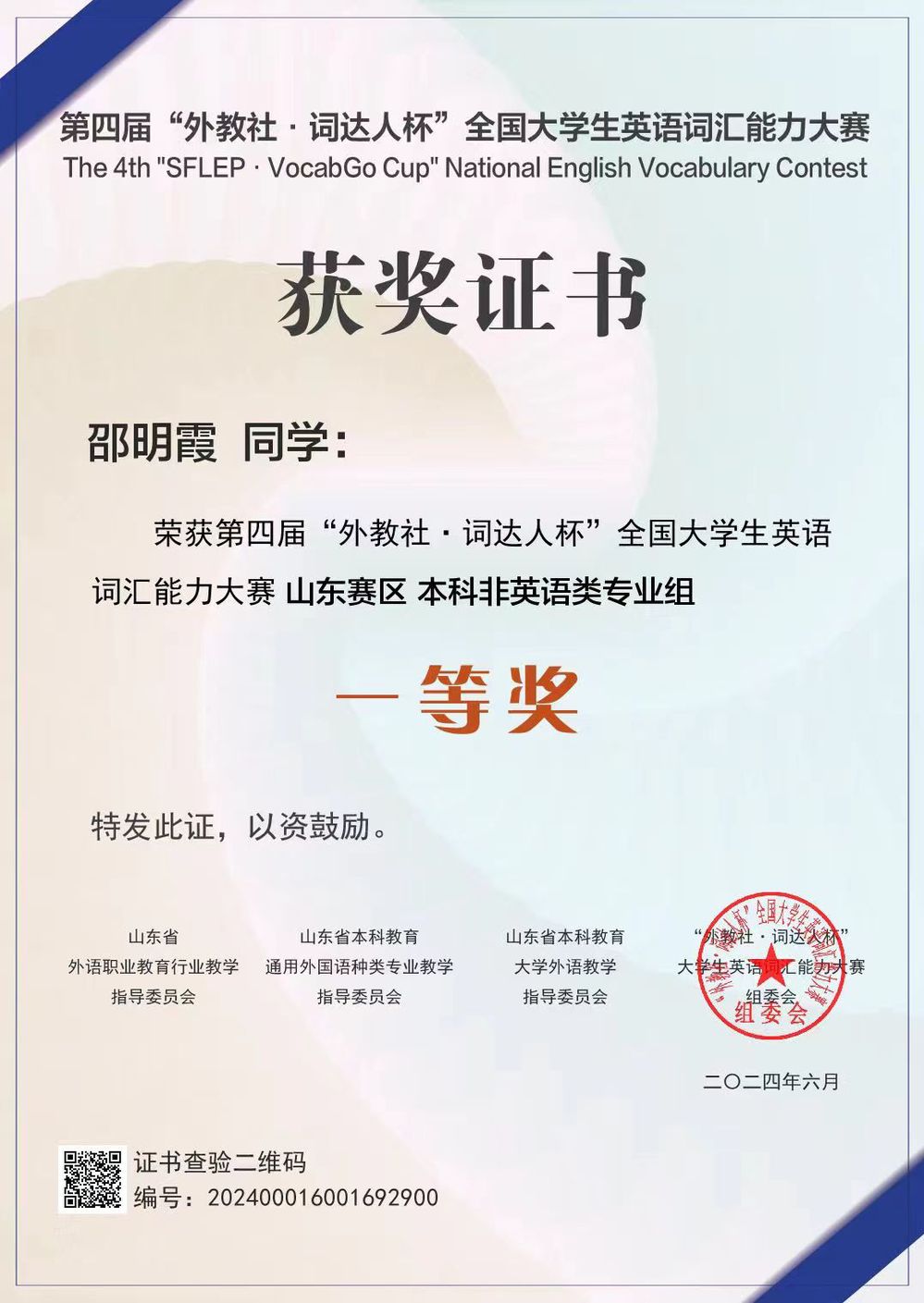近日,第四届“外教研,词达人杯”大学生英语词汇能力大赛在全国各地拉开帷幕,前期通过校赛筛选出前5%进入省赛,91暗网 2022级本科生邵明霞进入省赛并在山东省各高校竞赛中获得一等奖。
