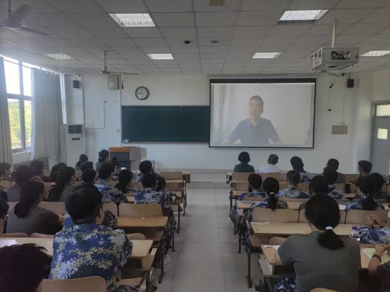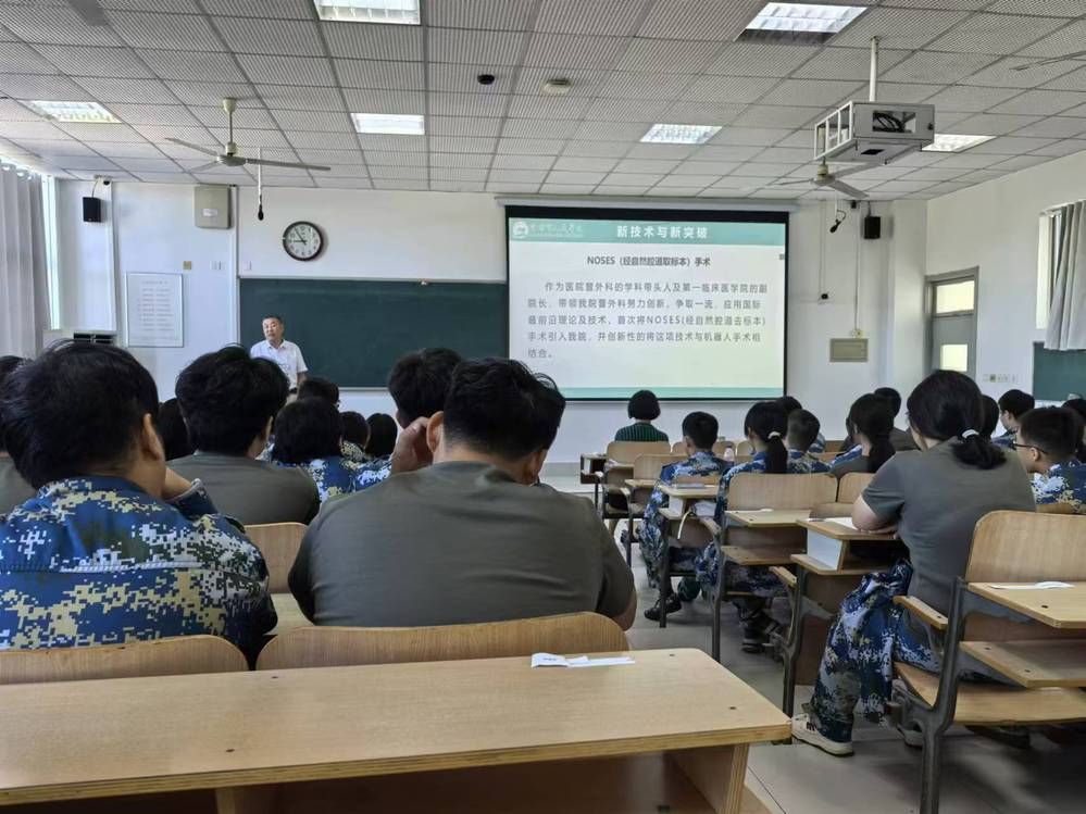 李军以“医学新生 梦想与担当同行”为题,围绕学院历史、特色和优势等方面展开叙述。一是学院简介方面,向同学们介绍了住院手术例数、人才队伍建设和重症医学科等国家级项目;二是学院发展方面,以引入NOSES手术与达芬奇机器人结合等为例介绍医院的新技术和新突破;三是教育教学方面,通过购置先进仪器设备、开通24小时医学频道和建立特色“三导师制”为教育教学提供有力保障;四是新生寄语:医学之路,道阻且长,个人的成长需要付出大量的时间和精力,鼓励同学们为成为一名优秀的医学人才而不懈奋斗。