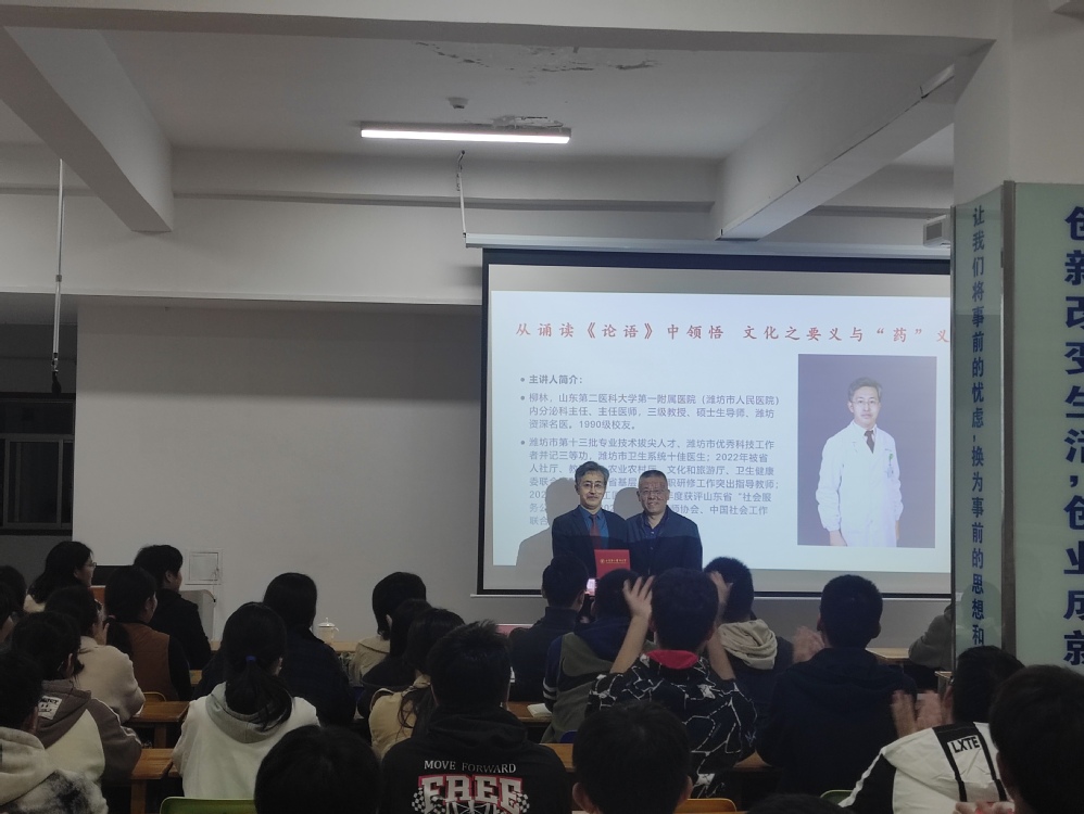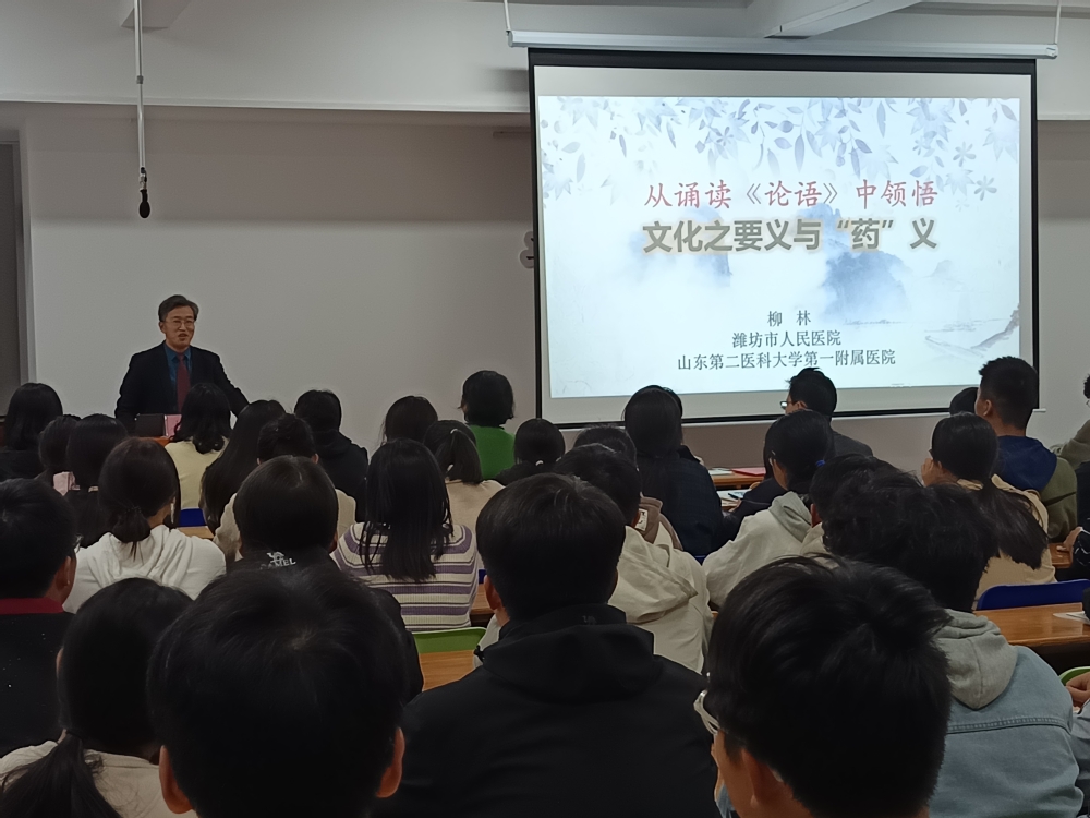 柳林从文化的要义、文化的药义、医学与儒学文化交融下的健康理念、现代医学文化与健康、习惯成就人生几个部分,阐述文化的要义即文化是什么,文化特征的组成部分,各组分间的关系;文化的药义即医学与儒学文化交融浸染,医学与儒学相互影响的理念,对我国高等院校医学人文教育现状进行剖析;结合当代社会对医疗服务需求现状,强调秉承正确的义利观与实践精神;最后呼吁现代医学文化与健康休戚相关,以健康为中心,人人养成人生良好习惯。柳老师讲课,医学和儒学水乳交融、典故信手拈来,讲堂内笑声朗朗、掌声阵阵,同学们不知不觉沉浸其中,享受了一场医学和儒学的文化盛宴。