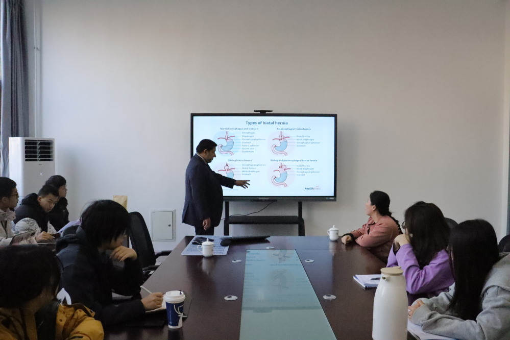 Yasser Farooque教授在会议室作《Interesting cases in Upper GI surgery》学术讲座,围绕个人研究核心为同学们阐述膈疝(hiatal hernia)和胃癌(gastric cancer)的发病关联、病理特征及治疗策略,通过讲解多个手术过程中的视频记录,生动形象的介绍病理机制知识,用流利清晰的英语和丰富的临床经验使师生们拓宽了医学知识视野。教授从手术的治疗和发病机制的研究的角度出发,以自身的临床实践经历和自身的研究方向为题,为师生研究方向作出切实可行的建议。会上氛围热烈,参加师生积极互动,受益良多。