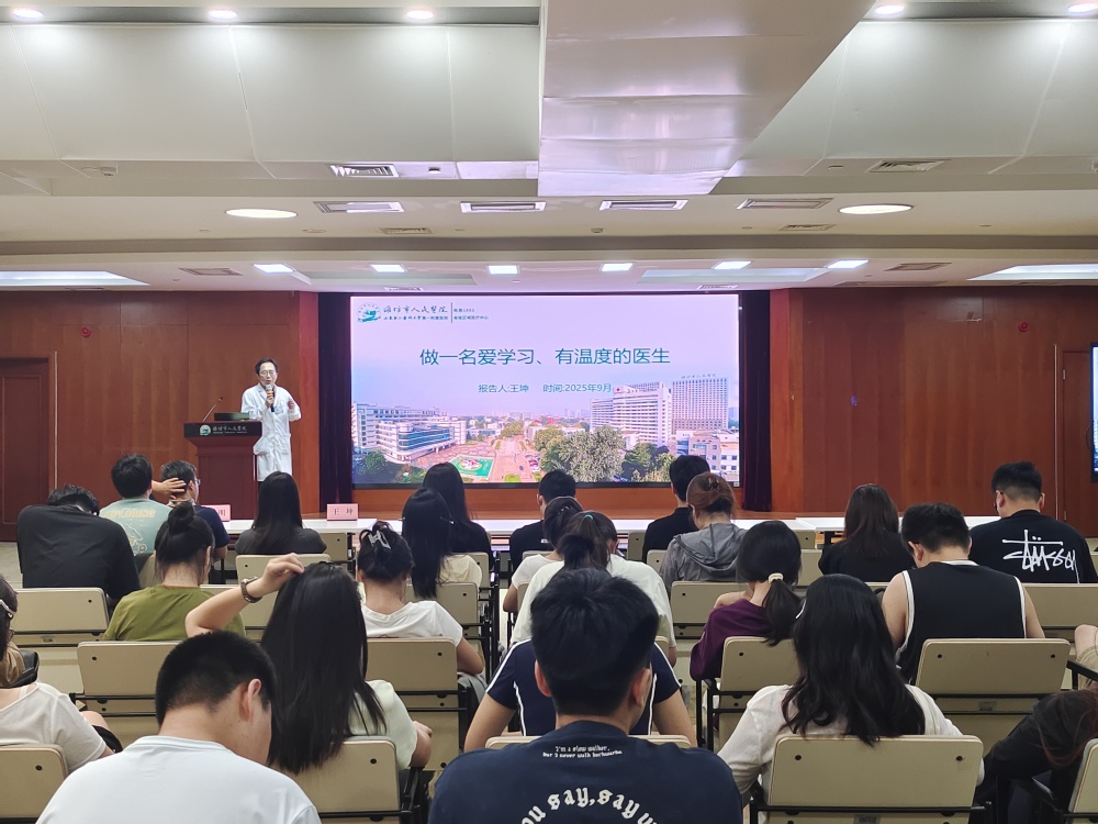 王坤以“做一名爱学习、有温度的医生”为题,结合从医经历和科室建设经验,阐述医生应“功夫下在平时”,注重理论基础与临床实践紧密结合。分享 “医道无术不行,医术无道不久”的感悟,引导同学们在持续精进专业能力的同时,更要培养医患沟通能力、人文关怀素养和多学科协作意识,成为“既有医术,更有温度”的健康守护者。