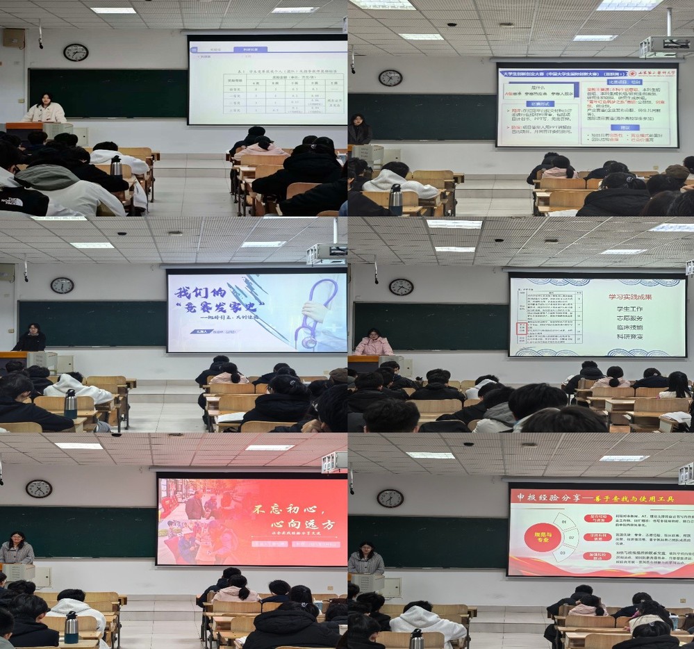 经验交流会上,杨慧琳系统介绍各类与医学生息息相关的专业竞赛,同时聚焦全国大学生生命科学竞赛、“挑战杯”等赛事,详细分享了比赛流程、时间安排,以及研究综述撰写、实验设计、演讲答辩的实用技巧。赵靖彤同学结合自身经历,给出大学生创新创业训练计划项目的准备建议,拆解了“三创赛”的自我认知要点,并细致讲解全国大学生基础医学创新研究暨实验设计论坛的PPT制作技巧。高萌围绕课题组选择、入组必备能力展开分享,结合医创赛、生科赛的参赛经历,拆解答辩环节的准备重点。李家馨针对大学生职业规划大赛成长赛道,清晰梳理了所需材料、参赛切入点,以及实践成果展示与评审标准。邵明霞注重英语学习与科研能力的协同提升,分享兼具实用性与指导性的双重技巧,内容涵盖高效英语学习方法、高水平英语赛事备赛攻略,详细拆解助研机会的获取路径,鼓励同学们打破局限、勇敢尝试,在实践中实现双向成长。查桂荣带来社会实践领域的经验分享,结合组织“返家乡”活动的经历,谈到沟通与耐心是实践活动顺利推进的关键,同时分享社会实践申报的小窍门——善于查找和运用各类工具。