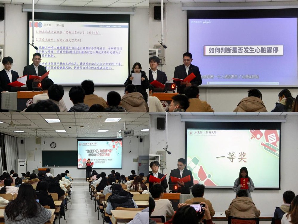 活动坚持“层层递进、公平公正”原则,采用三级进阶式竞赛模式,兼顾参与广度与专业深度。初赛通过问卷星线上答题夯实医学基础知识,复赛以线下纸质答题考查知识应用能力,决赛采用现场竞答形式,设置选择抢答、简答论述双轮比拼,增设“风险抢答”“案例分析”等环节,参赛选手凭借团队协作、快速反应与精准作答,充分展现扎实的医学功底与良好的精神风貌。题目内容涵盖日常急救、常见病防治、合理用药、健康生活方式等领域,贴近生活实际,助力学生将理论知识转化为护己护家的实战本领。6支决赛队伍比分胶着、精彩迭出,最终决出一等奖1名、二等奖2名、三等奖3名,不仅实现了以赛促学、以赛会友的初衷,更让学生在竞技中提升了组织协调能力与责任意识。